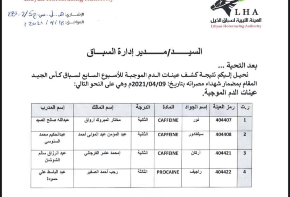 السادة ملاك ومدربي خيول السباق الكرامنحيل اليكم نتائج تحاليل العينات الموجبة للأسبوع السابعمن السباقات التمهيدية “كأس الجيد”.
