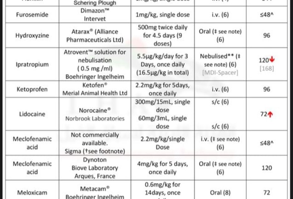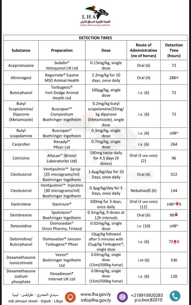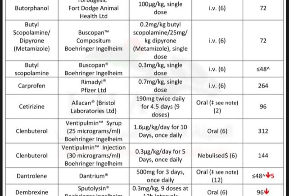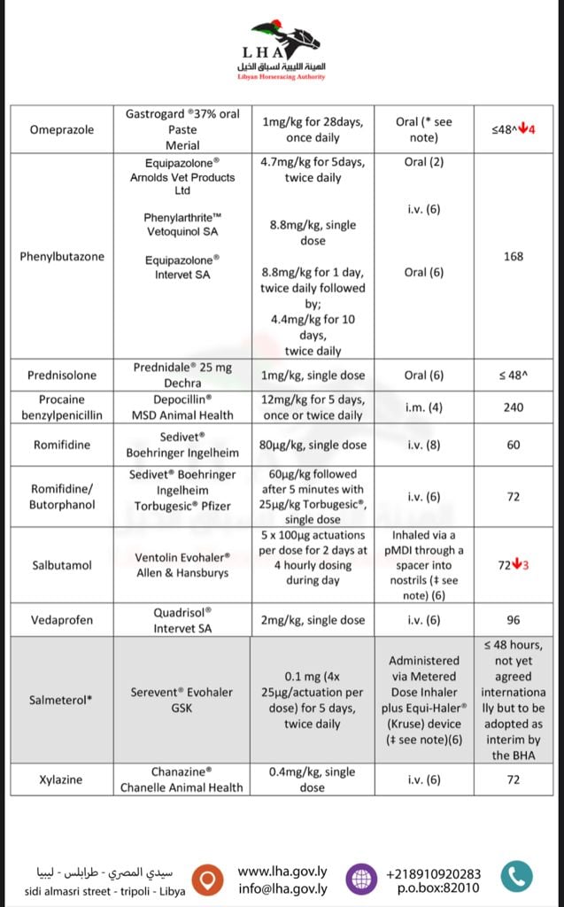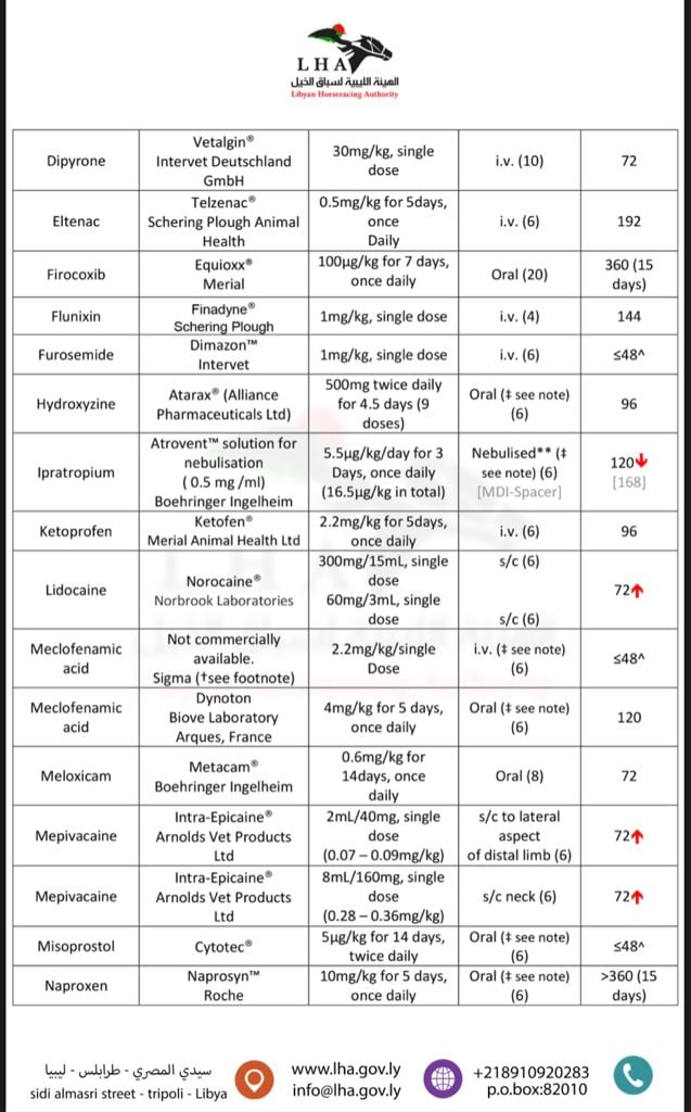 نحيل اليكم قائمة الادوية الطبية البيطرية الشائع استخدامها في علاج الخيول والفترة اللازمة للإيقاف قبل موعد السباق.