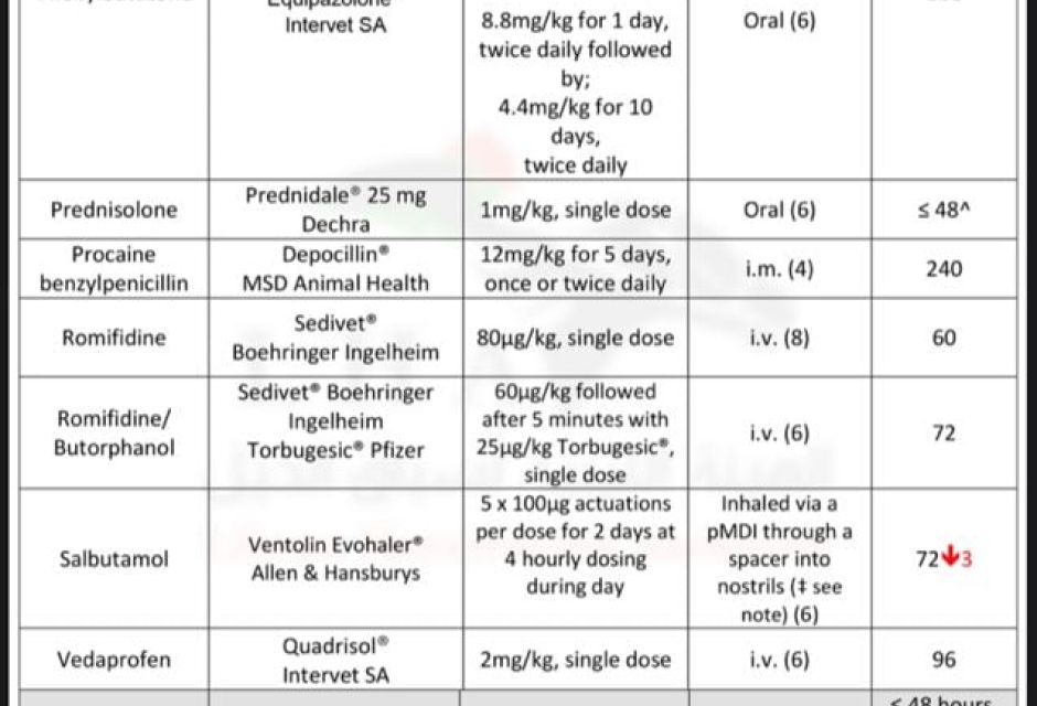 قائمة الادوية الطبية البيطرية الشائع استخدامها في علاج الخيول والفترة اللازمة للإيقاف قبل موعد السباق.