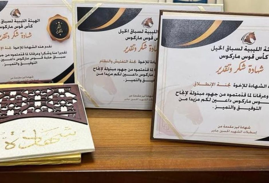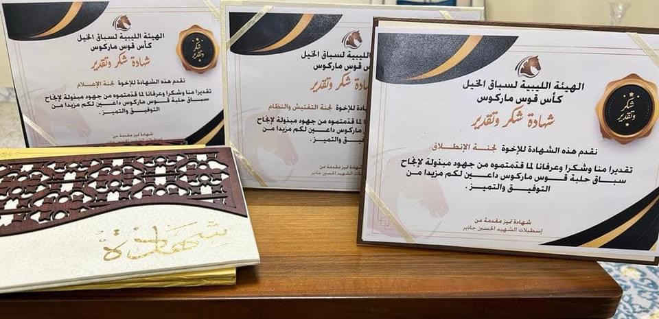 وعلى هامش السباق قدمت للسيد رئيس مجلس الادارة عدد من شهادات التقدير مقدمة من اسطبلات الشهيد الحسين جادير للجان المشرفة على تنظيم سباق قوس ماركوس تقديرا وعرفانا منها بدورهم في نجاح السباق وحسن التنظيم ..