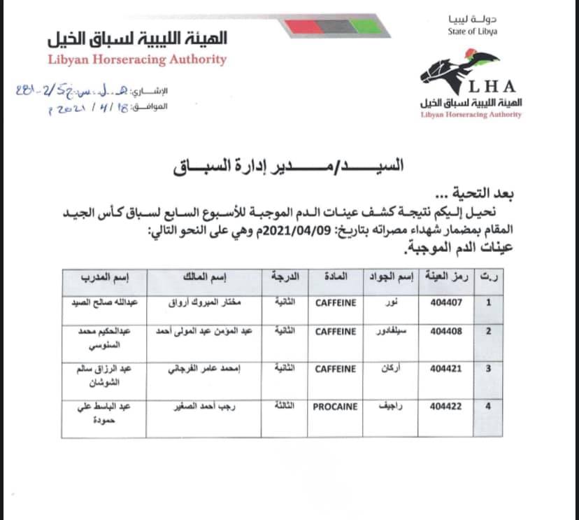 السادة ملاك ومدربي خيول السباق الكرامنحيل اليكم نتائج تحاليل العينات الموجبة للأسبوع السابعمن السباقات التمهيدية…