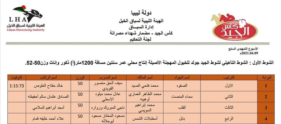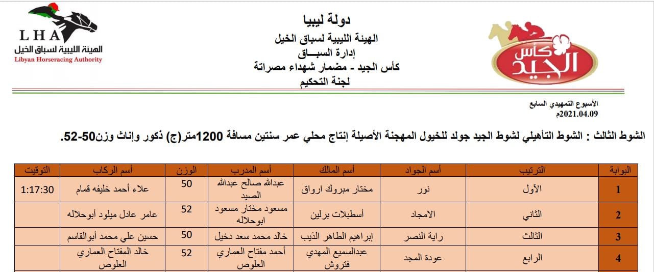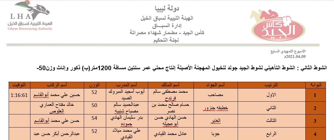 نتيجة الشوط الأول الشوط التأهيلي لشوط الجيد جولد للخيول المهجنة الأصيلة انتاج محلي عمر سنتين مسافة 1200متر (أ) ذكور وان…